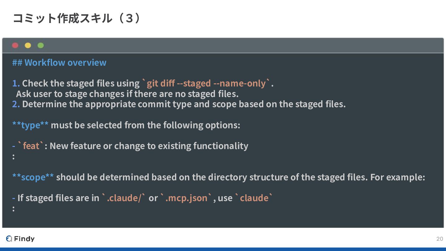 using `git diff --staged --name-only`. Ask user to stage changes if there are no staged files. 2. Determine the appropriate commit type and scope based on the staged files. **type** must be selected from the following options: - `feat`: New feature or change to existing functionality : **scope** should be determined based on the directory structure of the staged files. For example: - If staged files are in `.claude/` or `.mcp.json`, use `claude` :