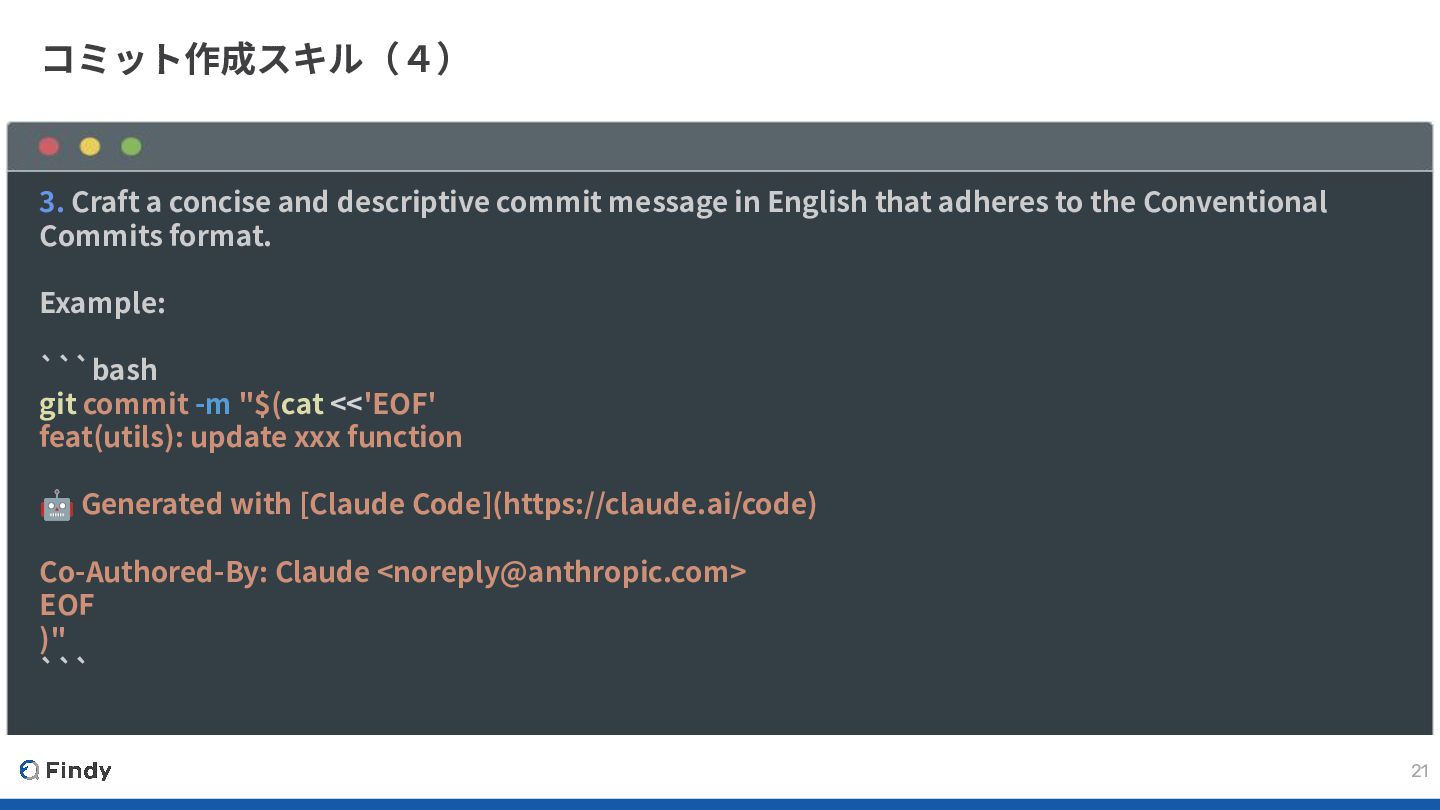 in English that adheres to the Conventional Commits format. Example: ```bash git commit -m "$(cat <<'EOF' feat(utils): update xxx function 🤖 Generated with [Claude Code](https://claude.ai/code) Co-Authored-By: Claude <[email protected]> EOF )" ```