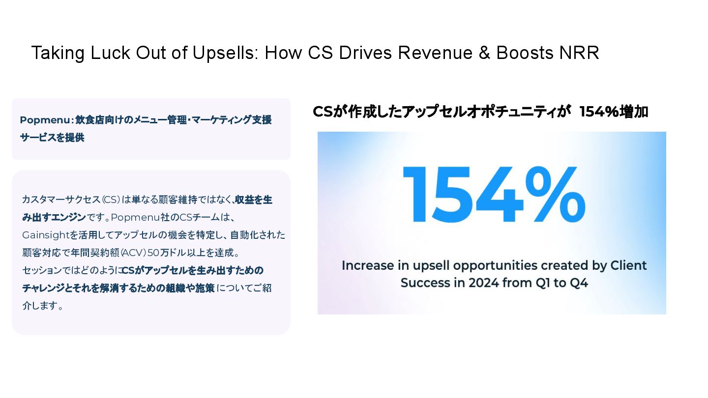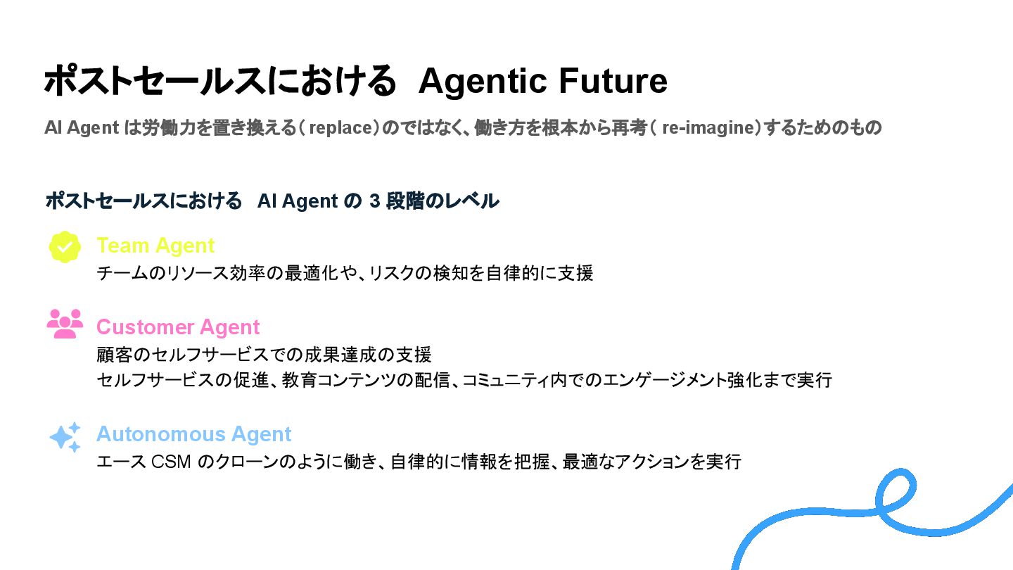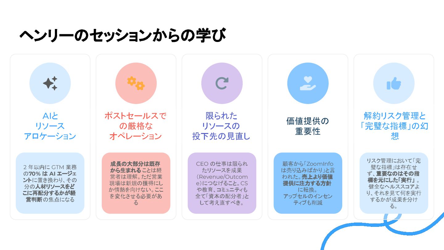 分の人材リソースをど こに再配分するかが経 営判断の焦点になる AIと リソース アロケーション 成長の大部分は既存 から生まれる ことは経 営者は理解。ただ営業 現場は新規の獲得にし か情熱を向けない。ここ を変化させる必要があ る ポストセールスで の厳格な オペレーション CEO の仕事は限られ たリソースを成果 (Revenue/Outcom e)につなげること。CS や教育、コミュニティも 全て「資本の配分者」と して考え直すべき。 限られた リソースの 投下先の見直し 顧客から「ZoomInfo は売り込みばかり」と言 われた。売上より価値 提供に注力する方針 に転換。 アップセルのインセン ティブも削減 価値提供の 重要性 リスク管理において「完 璧な指標」は存在せ ず、重要なのはその指 標を元にした「実行」 。 健全なヘルススコアよ り、それを見て何を実行 するかが成果を分け る。 解約リスク管理と 「完璧な指標」の幻 想