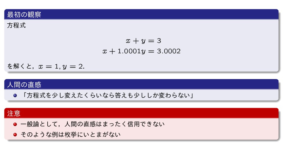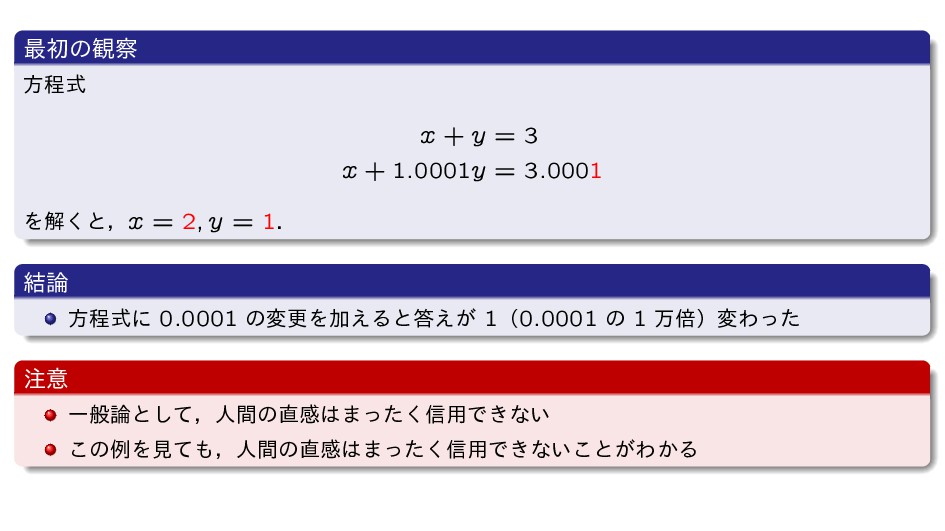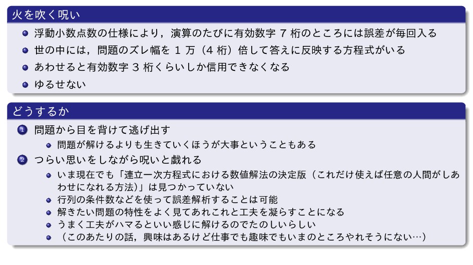 ܻ͘Β͍͔͠৴༻Ͱ͖ͳ͘ͳΔ ΏΔͤͳ͍ Ͳ͏͢Δ͔ 1 ͔ΒΛഎ͚ͯಀ͛ग़͢ ͕ղ͚ΔΑΓੜ͖͍ͯ͘΄͏͕େࣄͱ͍͏͜ͱ͋Δ 2 ͭΒ͍ࢥ͍Λ͠ͳ͕Βढ͍ͱٔΕΔ ͍·ݱࡏͰʮ࿈ཱҰ࣍ํఔࣜʹ͓͚Δղ๏ͷܾఆ൛ʢ͜Ε͚ͩ͑ҙͷਓ͕ؒ͋͠ ΘͤʹͳΕΔํ๏ʣ ʯݟ͔͍ͭͬͯͳ͍ ߦྻͷ݅ͳͲΛͬͯޡࠩղੳ͢Δ͜ͱՄೳ ղ͖͍ͨͷಛੑΛΑ͘ݟͯ͋Ε͜ΕͱΛڽΒ͢͜ͱʹͳΔ ͏·͕͘ϋϚΔͱ͍͍ײ͡ʹղ͚ΔͷͰͨͷ͍͠Β͍͠ ʢ͜ͷ͋ͨΓͷɼڵຯ͋Δ͚ͲࣄͰझຯͰ͍·ͷͱ͜ΖΕͦ͏ʹͳ͍ʜʣ