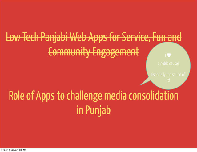 Community Engagement Role of Apps to challenge media consolidation in Punjab I — a noble cause! Especially the sound of it! Friday, February 22, 13