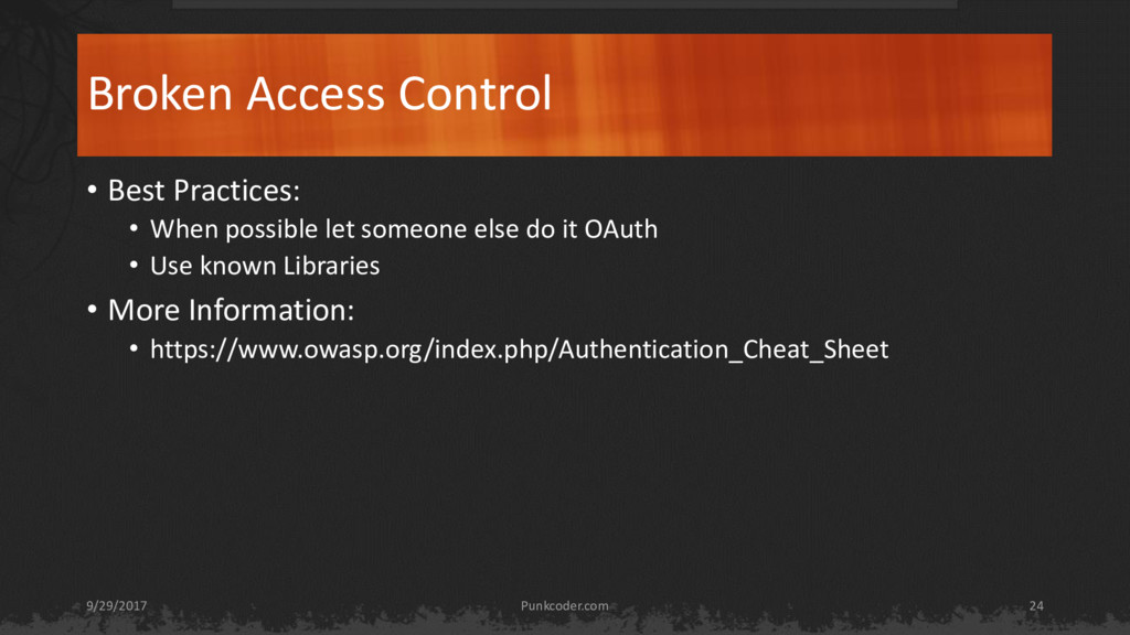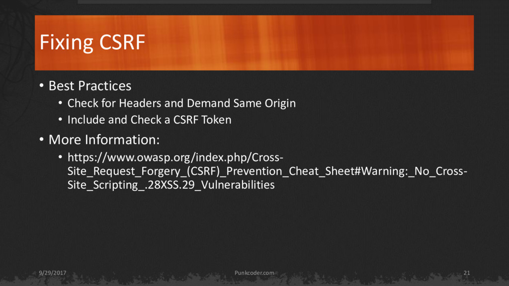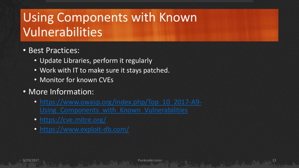 • Enable HTTPS, Transmit all Data Securely • Never Store Data in ClearText • Encrypt, using known best practices, don’t roll your own. • Ensure that there is no cache where sensitive data is concerned • More Information: • https://www.owasp.org/index.php/Top_10_2017-A6- Sensitive_Data_Exposure • https://blog.detectify.com/2016/07/01/owasp-top-10-sensitive-data- exposure-6/