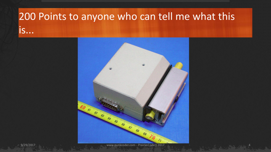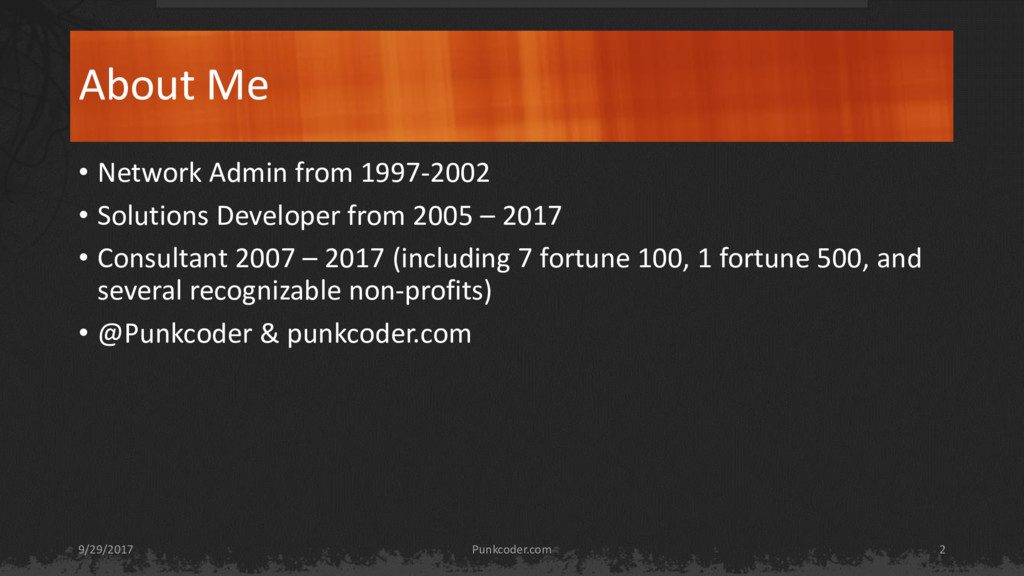 and employed in the technology field since 1998. • All of the names have been changed to protect the guilty, the innocent have their own vindication. www.punkcoder.com - Prairie.Code() 2017 9/29/2017 3