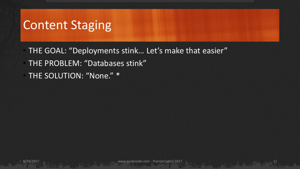 know how to use it so we should make it the backend for our website.” • THE PROBLEM: “Any time you have a problem that can be solved with SharePoint means that you now have two problems.” • THE SOLUTION: “Understand what the technology does well play to its strengths, have a plan around it’s problems.” www.punkcoder.com - Prairie.Code() 2017 9/29/2017 13