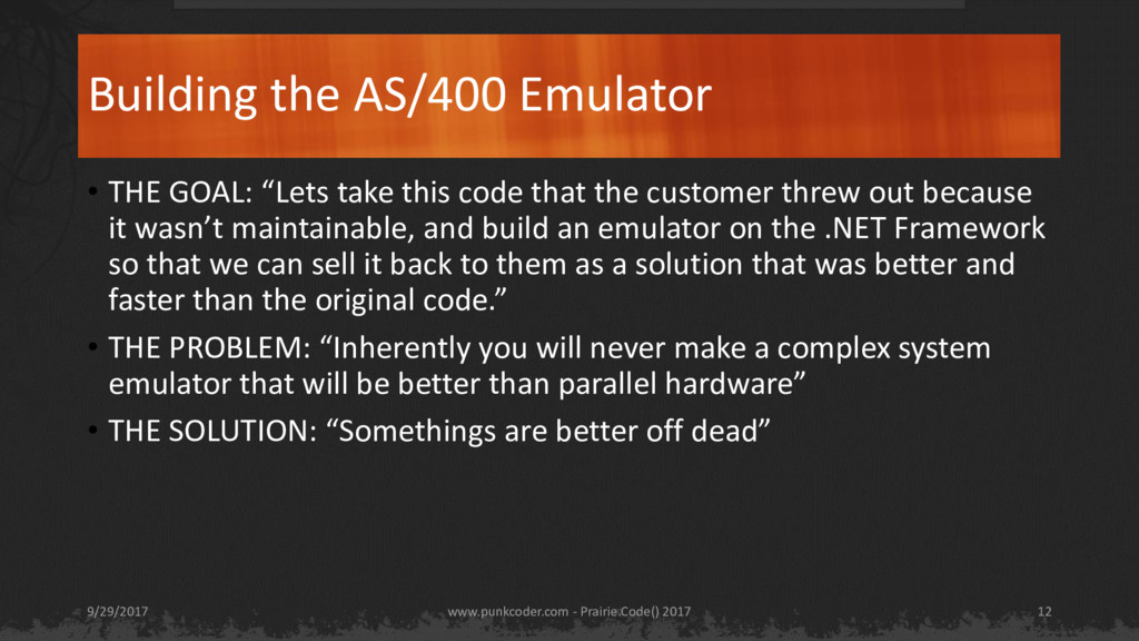code that the customer threw out because it wasn’t maintainable, and build an emulator on the .NET Framework so that we can sell it back to them as a solution that was better and faster than the original code.” • THE PROBLEM: “Inherently you will never make a complex system emulator that will be better than parallel hardware” • THE SOLUTION: “Somethings are better off dead” www.punkcoder.com - Prairie.Code() 2017 9/29/2017 12