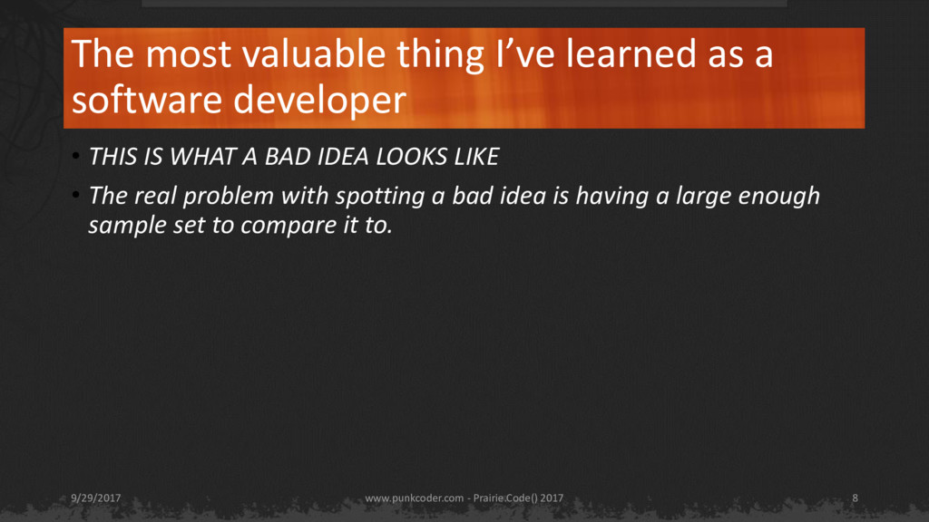 • THIS IS WHAT A BAD IDEA LOOKS LIKE • The real problem with spotting a bad idea is having a large enough sample set to compare it to. www.punkcoder.com - Prairie.Code() 2017 9/29/2017 8