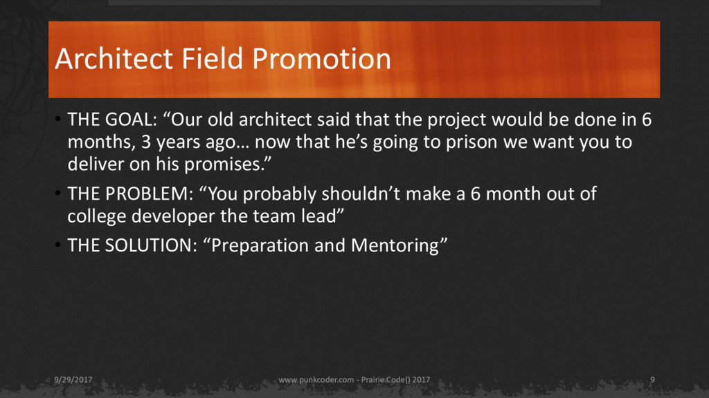 that the project would be done in 6 months, 3 years ago… now that he’s going to prison we want you to deliver on his promises.” • THE PROBLEM: “You probably shouldn’t make a 6 month out of college developer the team lead” • THE SOLUTION: “Preparation and Mentoring” www.punkcoder.com - Prairie.Code() 2017 9/29/2017 9