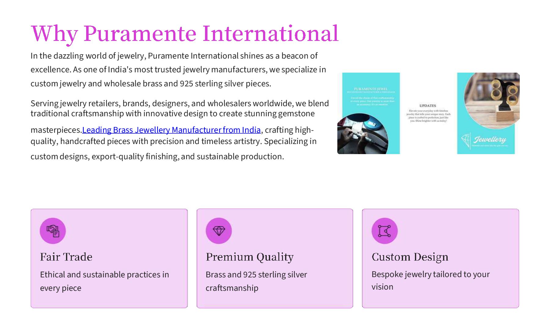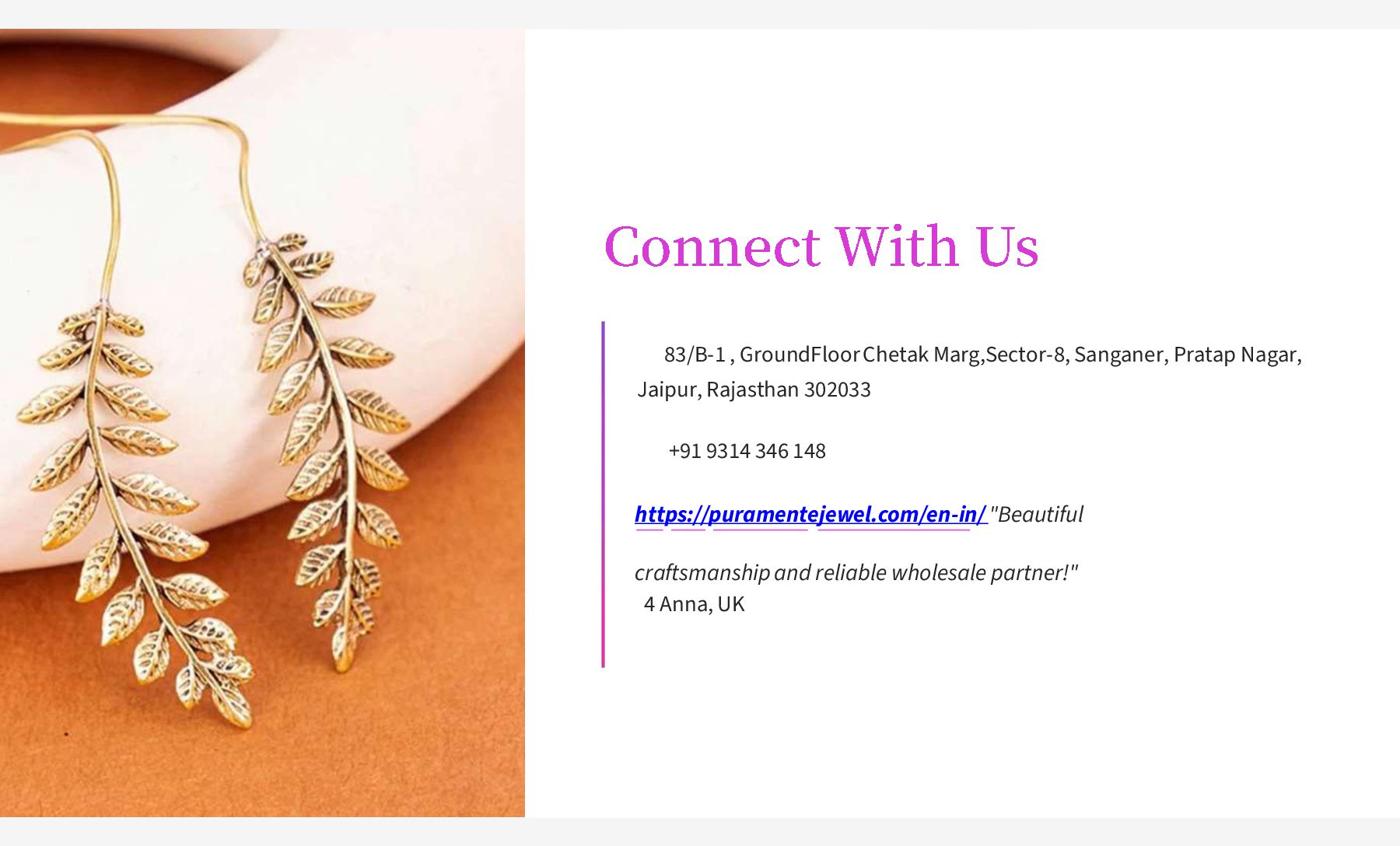 Puramente Jewel is a leading Brass Jewellery Manufacturer from India, offering handcrafted designs that combine traditional artistry with modern aesthetics. As part of Puramente International, we specialize in high-quality brass jewellery crafted for global markets, delivering timeless elegance, precision craftsmanship, and reliable wholesale solutions.