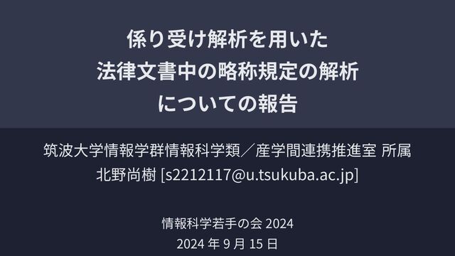 Katsuhiko Toyama. A Pattern-Based Approach to Hyponymy Relation Acquisition for the Agricultural Thesaurus. In Proceedings of AOS2012, pages 2-9, 2012. 中村誠,小川泰弘,外山勝彦.法令文中において括弧書きで定義されてい る法令用語とその語釈文の抽出. 言語処理学会第 19 回年次大会発表論文 集. 2013, pp.670-673 基本的に法令コーパスを用いて解析する手法を取っている。 ただし、複数の規定文の解析ができないなどの制約が存在している