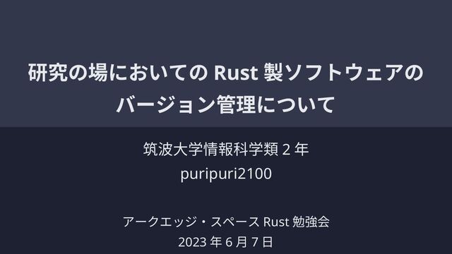 研究の場においての Rust 製ソフトウェアの バージョン管理について 筑波大学情報科学類 2 年 puripuri2100 アークエッジ・スペース Rust