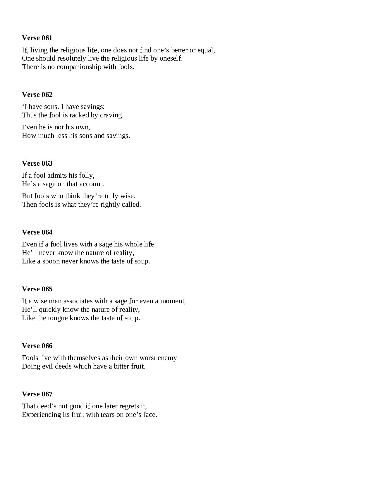 find one’s better or equal, One should resolutely live the religious life by oneself. There is no companionship with fools. Verse 062 ‘I have sons. I have savings: Thus the fool is racked by craving. Even he is not his own, How much less his sons and savings. Verse 063 If a fool admits his folly, He’s a sage on that account. But fools who think they’re truly wise. Then fools is what they’re rightly called. Verse 064 Even if a fool lives with a sage his whole life He’ll never know the nature of reality, Like a spoon never knows the taste of soup. Verse 065 If a wise man associates with a sage for even a moment, He’ll quickly know the nature of reality, Like the tongue knows the taste of soup. Verse 066 Fools live with themselves as their own worst enemy Doing evil deeds which have a bitter fruit. Verse 067 That deed’s not good if one later regrets it, Experiencing its fruit with tears on one’s face.