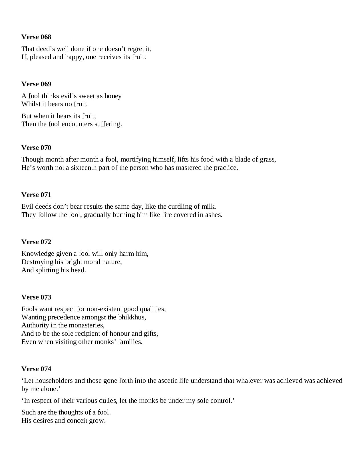 it, If, pleased and happy, one receives its fruit. Verse 069 A fool thinks evil’s sweet as honey Whilst it bears no fruit. But when it bears its fruit, Then the fool encounters suffering. Verse 070 Though month after month a fool, mortifying himself, lifts his food with a blade of grass, He’s worth not a sixteenth part of the person who has mastered the practice. Verse 071 Evil deeds don’t bear results the same day, like the curdling of milk. They follow the fool, gradually burning him like fire covered in ashes. Verse 072 Knowledge given a fool will only harm him, Destroying his bright moral nature, And splitting his head. Verse 073 Fools want respect for non-existent good qualities, Wanting precedence amongst the bhikkhus, Authority in the monasteries, And to be the sole recipient of honour and gifts, Even when visiting other monks’ families. Verse 074 ‘Let householders and those gone forth into the ascetic life understand that whatever was achieved was achieved by me alone.’ ‘In respect of their various duties, let the monks be under my sole control.’ Such are the thoughts of a fool. His desires and conceit grow.
