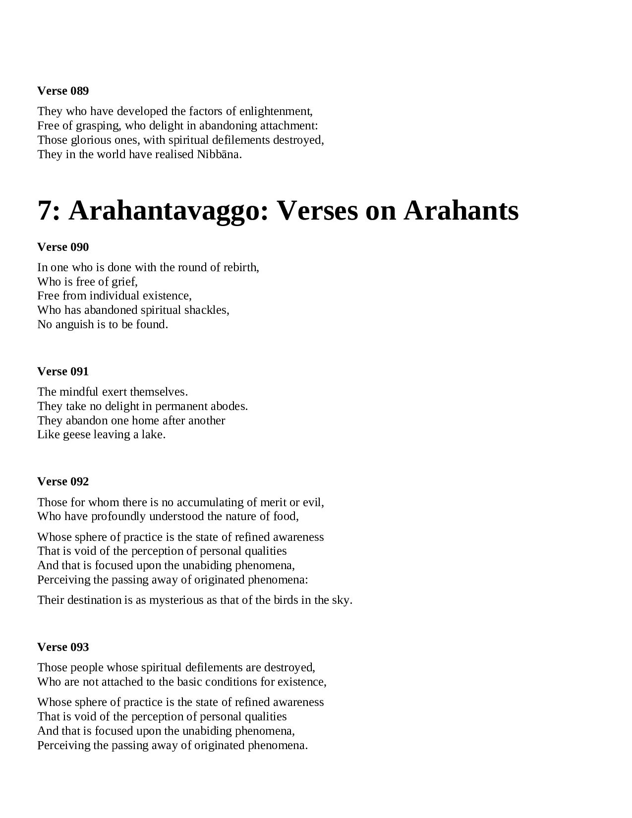 Free of grasping, who delight in abandoning attachment: Those glorious ones, with spiritual defilements destroyed, They in the world have realised Nibbāna. 7: Arahantavaggo: Verses on Arahants Verse 090 In one who is done with the round of rebirth, Who is free of grief, Free from individual existence, Who has abandoned spiritual shackles, No anguish is to be found. Verse 091 The mindful exert themselves. They take no delight in permanent abodes. They abandon one home after another Like geese leaving a lake. Verse 092 Those for whom there is no accumulating of merit or evil, Who have profoundly understood the nature of food, Whose sphere of practice is the state of refined awareness That is void of the perception of personal qualities And that is focused upon the unabiding phenomena, Perceiving the passing away of originated phenomena: Their destination is as mysterious as that of the birds in the sky. Verse 093 Those people whose spiritual defilements are destroyed, Who are not attached to the basic conditions for existence, Whose sphere of practice is the state of refined awareness That is void of the perception of personal qualities And that is focused upon the unabiding phenomena, Perceiving the passing away of originated phenomena.