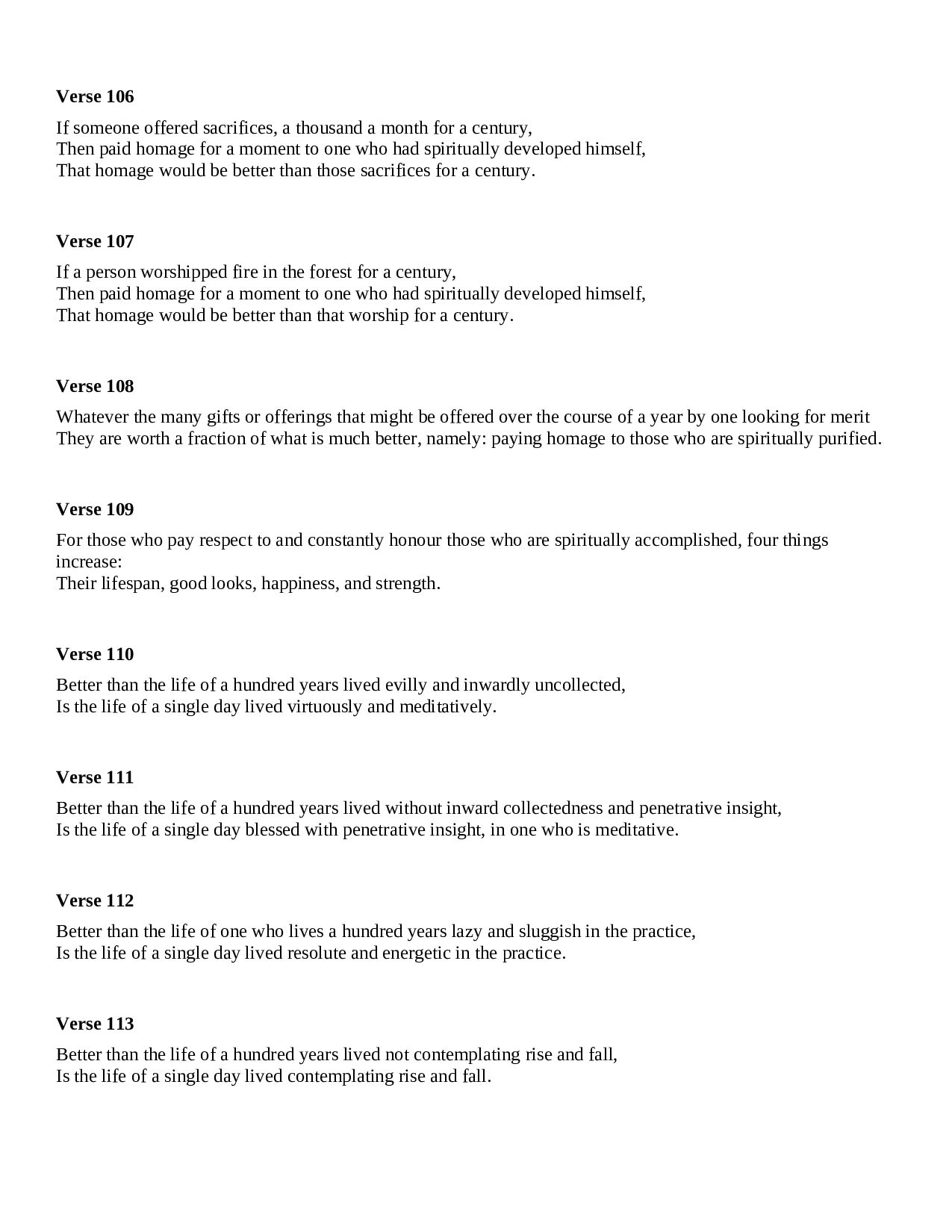 for a century, Then paid homage for a moment to one who had spiritually developed himself, That homage would be better than those sacrifices for a century. Verse 107 If a person worshipped fire in the forest for a century, Then paid homage for a moment to one who had spiritually developed himself, That homage would be better than that worship for a century. Verse 108 Whatever the many gifts or offerings that might be offered over the course of a year by one looking for merit They are worth a fraction of what is much better, namely: paying homage to those who are spiritually purified. Verse 109 For those who pay respect to and constantly honour those who are spiritually accomplished, four things increase: Their lifespan, good looks, happiness, and strength. Verse 110 Better than the life of a hundred years lived evilly and inwardly uncollected, Is the life of a single day lived virtuously and meditatively. Verse 111 Better than the life of a hundred years lived without inward collectedness and penetrative insight, Is the life of a single day blessed with penetrative insight, in one who is meditative. Verse 112 Better than the life of one who lives a hundred years lazy and sluggish in the practice, Is the life of a single day lived resolute and energetic in the practice. Verse 113 Better than the life of a hundred years lived not contemplating rise and fall, Is the life of a single day lived contemplating rise and fall.