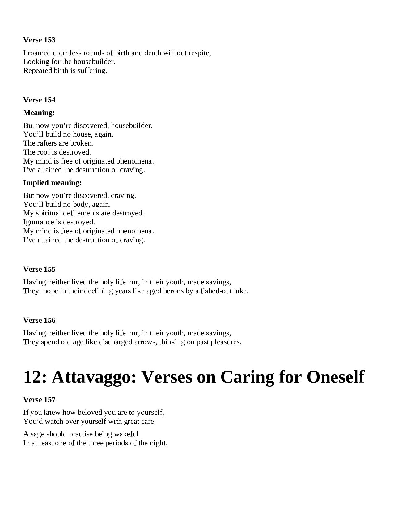 without respite, Looking for the housebuilder. Repeated birth is suffering. Verse 154 Meaning: But now you’re discovered, housebuilder. You’ll build no house, again. The rafters are broken. The roof is destroyed. My mind is free of originated phenomena. I’ve attained the destruction of craving. Implied meaning: But now you’re discovered, craving. You’ll build no body, again. My spiritual defilements are destroyed. Ignorance is destroyed. My mind is free of originated phenomena. I’ve attained the destruction of craving. Verse 155 Having neither lived the holy life nor, in their youth, made savings, They mope in their declining years like aged herons by a fished-out lake. Verse 156 Having neither lived the holy life nor, in their youth, made savings, They spend old age like discharged arrows, thinking on past pleasures. 12: Attavaggo: Verses on Caring for Oneself Verse 157 If you knew how beloved you are to yourself, You’d watch over yourself with great care. A sage should practise being wakeful In at least one of the three periods of the night.