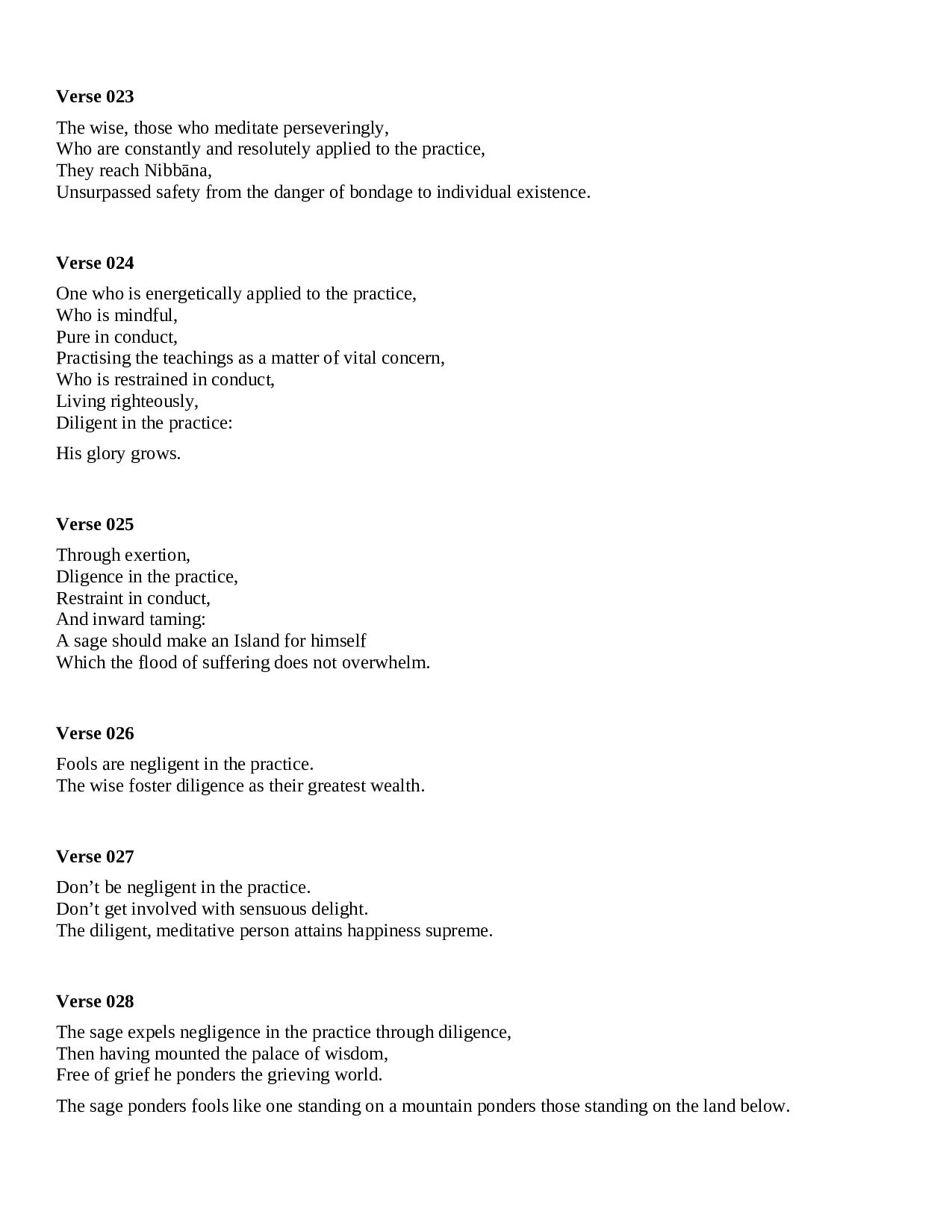 constantly and resolutely applied to the practice, They reach Nibbāna, Unsurpassed safety from the danger of bondage to individual existence. Verse 024 One who is energetically applied to the practice, Who is mindful, Pure in conduct, Practising the teachings as a matter of vital concern, Who is restrained in conduct, Living righteously, Diligent in the practice: His glory grows. Verse 025 Through exertion, Dligence in the practice, Restraint in conduct, And inward taming: A sage should make an Island for himself Which the flood of suffering does not overwhelm. Verse 026 Fools are negligent in the practice. The wise foster diligence as their greatest wealth. Verse 027 Don’t be negligent in the practice. Don’t get involved with sensuous delight. The diligent, meditative person attains happiness supreme. Verse 028 The sage expels negligence in the practice through diligence, Then having mounted the palace of wisdom, Free of grief he ponders the grieving world. The sage ponders fools like one standing on a mountain ponders those standing on the land below.