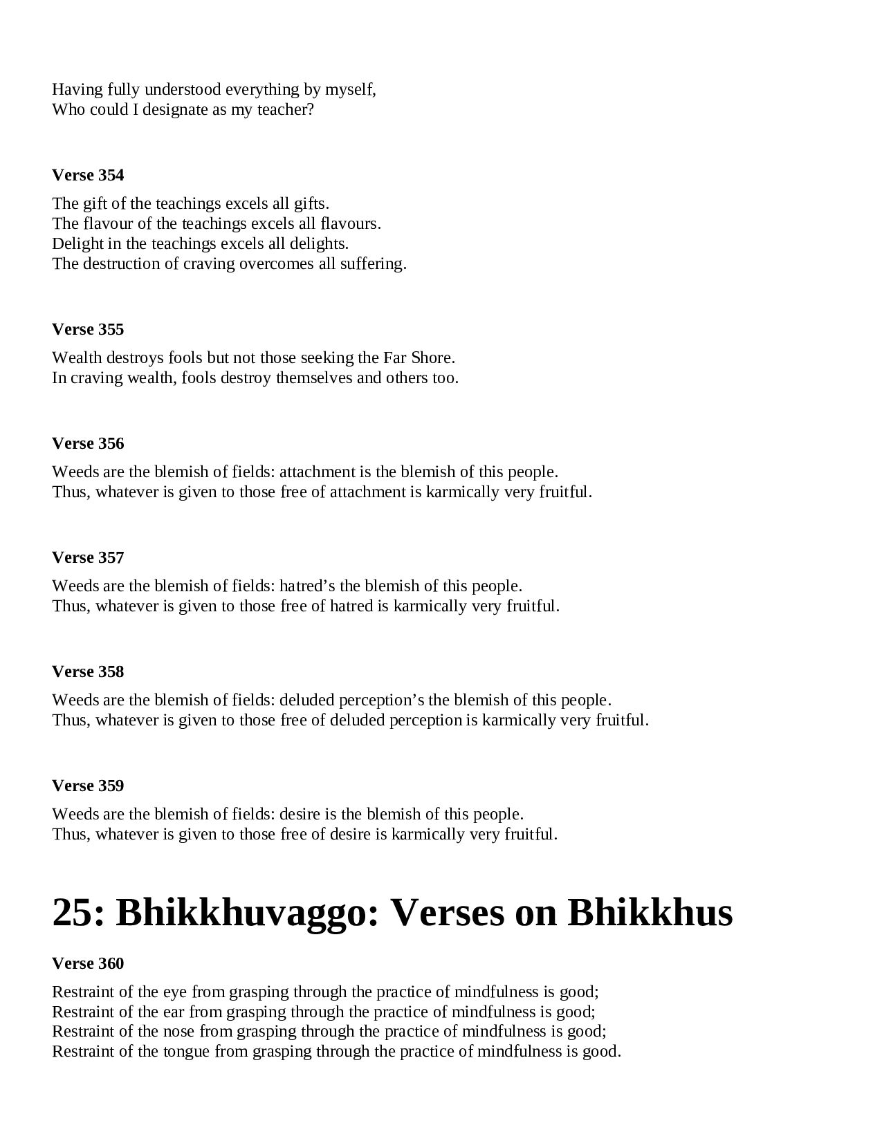 as my teacher? Verse 354 The gift of the teachings excels all gifts. The flavour of the teachings excels all flavours. Delight in the teachings excels all delights. The destruction of craving overcomes all suffering. Verse 355 Wealth destroys fools but not those seeking the Far Shore. In craving wealth, fools destroy themselves and others too. Verse 356 Weeds are the blemish of fields: attachment is the blemish of this people. Thus, whatever is given to those free of attachment is karmically very fruitful. Verse 357 Weeds are the blemish of fields: hatred’s the blemish of this people. Thus, whatever is given to those free of hatred is karmically very fruitful. Verse 358 Weeds are the blemish of fields: deluded perception’s the blemish of this people. Thus, whatever is given to those free of deluded perception is karmically very fruitful. Verse 359 Weeds are the blemish of fields: desire is the blemish of this people. Thus, whatever is given to those free of desire is karmically very fruitful. 25: Bhikkhuvaggo: Verses on Bhikkhus Verse 360 Restraint of the eye from grasping through the practice of mindfulness is good; Restraint of the ear from grasping through the practice of mindfulness is good; Restraint of the nose from grasping through the practice of mindfulness is good; Restraint of the tongue from grasping through the practice of mindfulness is good.