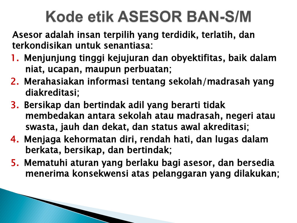 senantiasa: 1. Menjunjung tinggi kejujuran dan obyektifitas, baik dalam niat, ucapan, maupun perbuatan; 2. Merahasiakan informasi tentang sekolah/madrasah yang diakreditasi; 3. Bersikap dan bertindak adil yang berarti tidak membedakan antara sekolah atau madrasah, negeri atau swasta, jauh dan dekat, dan status awal akreditasi; 4. Menjaga kehormatan diri, rendah hati, dan lugas dalam berkata, bersikap, dan bertindak; 5. Mematuhi aturan yang berlaku bagi asesor, dan bersedia menerima konsekwensi atas pelanggaran yang dilakukan;