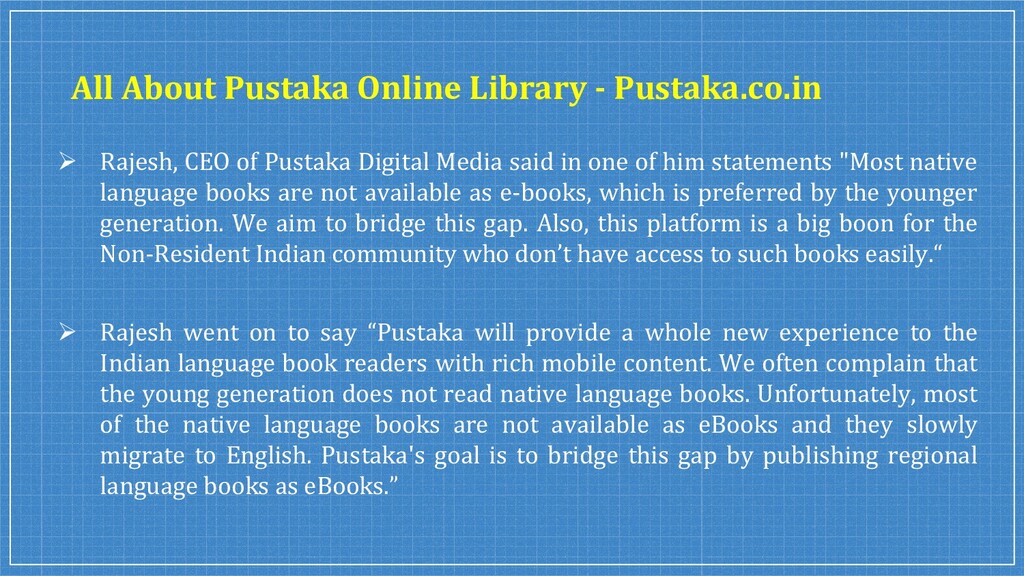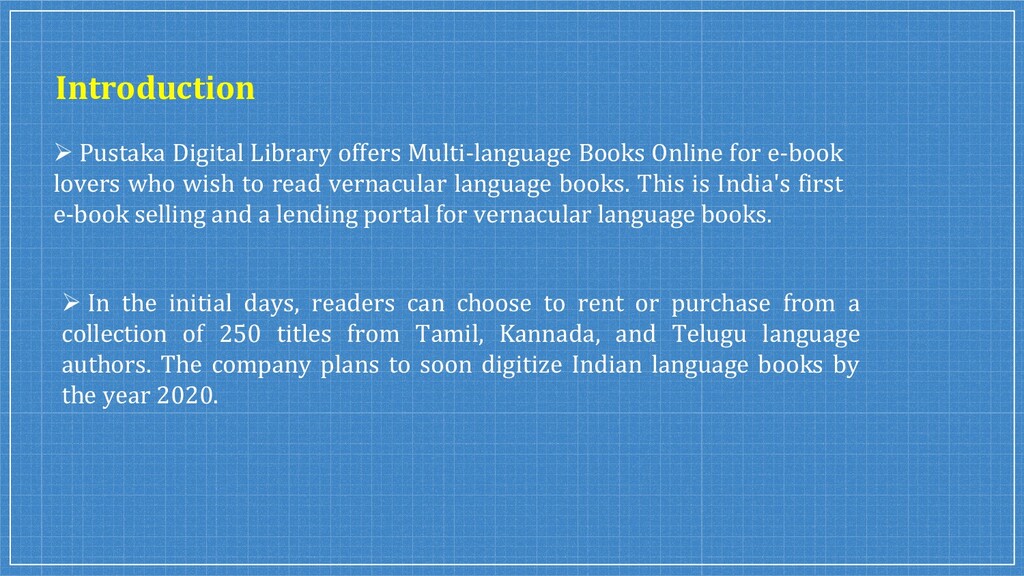 Pustaka is an online book rental service that provides a unique reading experience to book lovers with a wide range of books for every type of Multi-Language Novels from our best authors. Pustaka started as a private limited company in 2014 with the intent of publishing Indian regional multi-language books in a digital format with ease of use in the simple user interface.