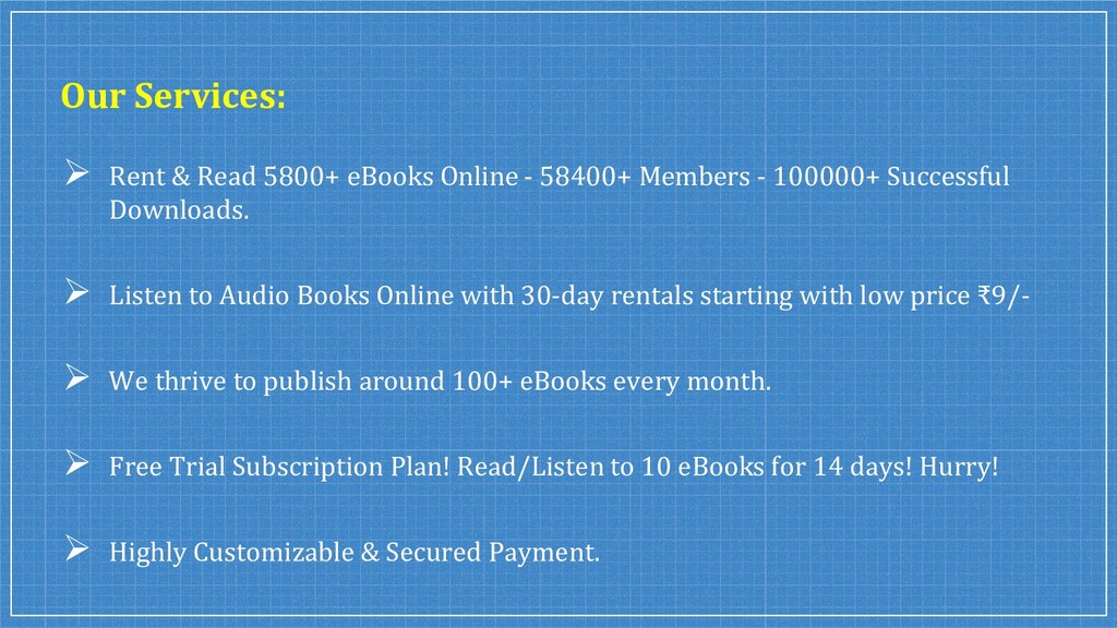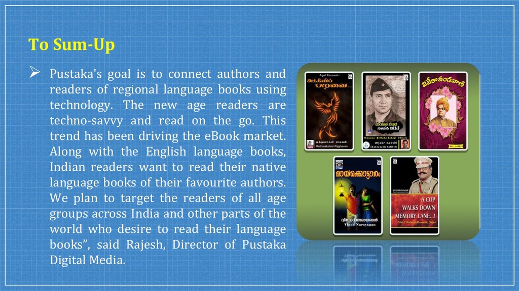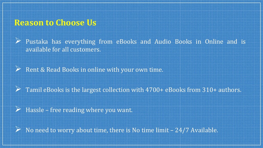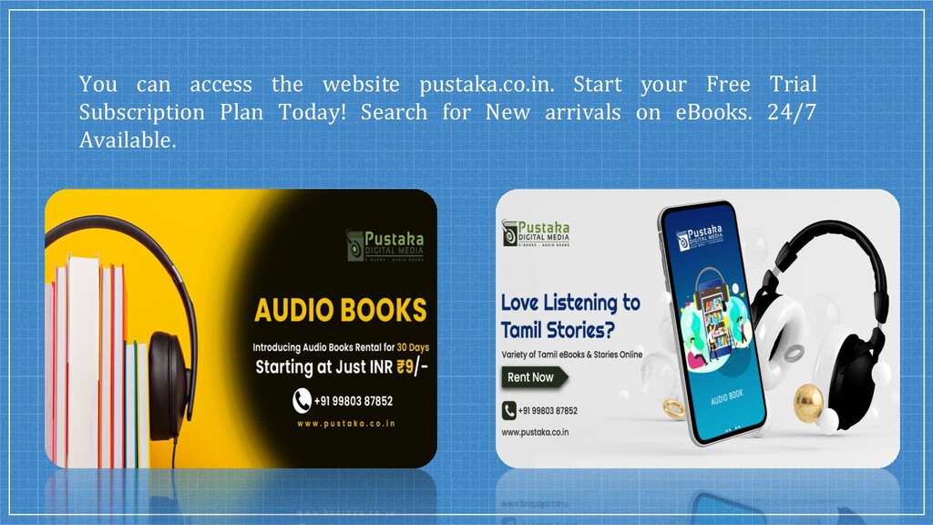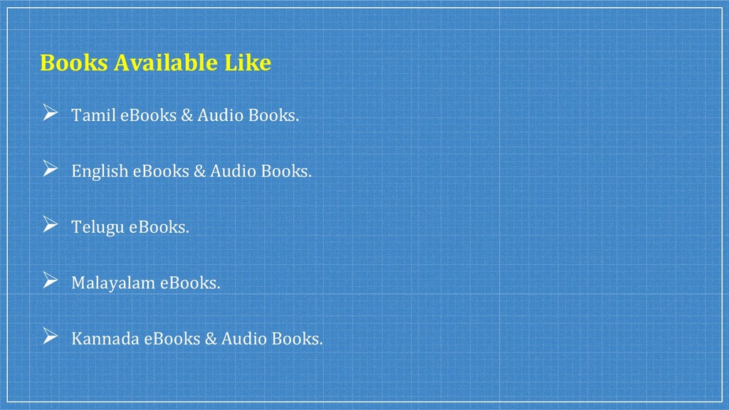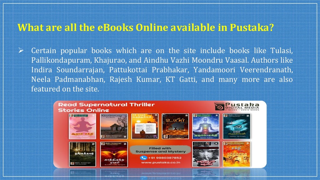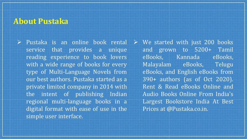 We started with just 200 books and grown to 5200+ Tamil eBooks, Kannada eBooks, Malayalam eBooks, Telugu eBooks, and English eBooks from 390+ authors (as of Oct 2020). Rent & Read eBooks & Audio Books Online From India's Largest Bookstore India At Best Prices at @Pustaka.co.in.