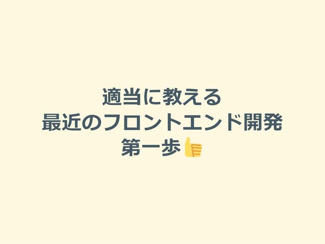 はじめに 最近のフロントエンド開発の第一歩をめちゃくち ゃ雑に紹介します (2017/10 現在) 目標は 「へぇ~こういうのもあるんだ~」 フロントエンドの開発環境は,毎年のように移り 変わっていくので,このスライドも 2018/10
