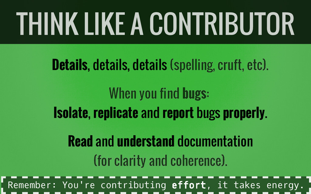 and understand documentation THINK LIKE A CONTRIBUTOR (spelling, cruft, etc). When you find bugs: (for clarity and coherence). R e m e m b e r : Y o u ' r e c o n t r i b u t i n g e f f o r t , i t t a k e s e n e r g y .