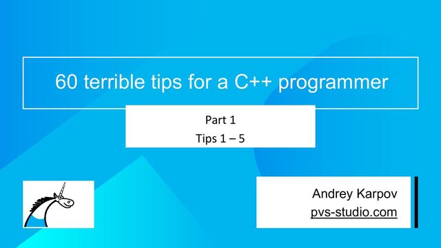 Hi! I'm Andrey Karpov, the CMO at PVS-Studio. I've been writing articles about static analysis and code quality for many years now. Now we are presenting you an e-book that contains 60 terrible tips for C++ developers. It's both sad and funny. Some tips may seem unbelievable or silly - but I've seen such patterns in real commercial products. Here I'm posting only 5 tips - to see the complete ebook, click here: https://pvs-studio.com/en/blog/posts/cpp/1053/