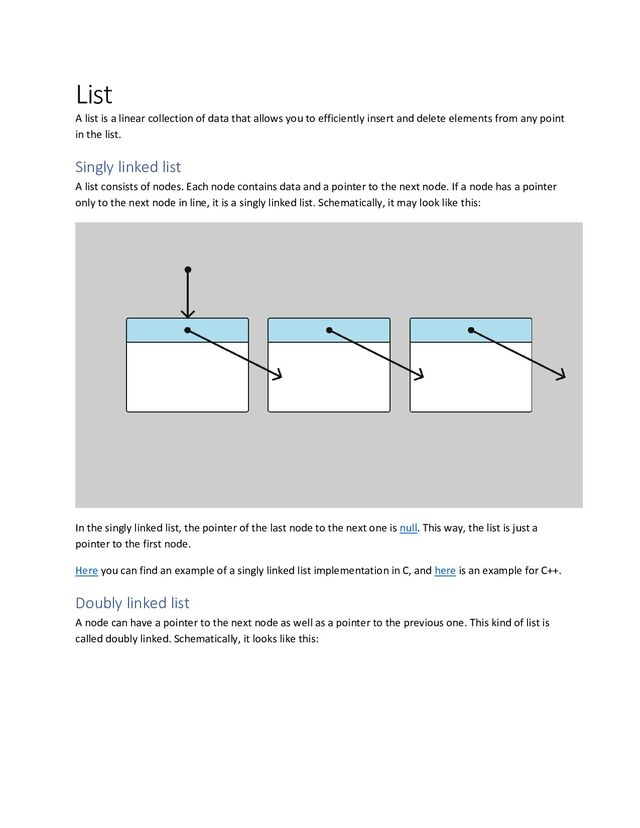 array of 1000 elements, 900 moves are needed. Thus, it takes O(n) to insert an element at any position except the end. Inserting an element at the end takes O(1). As we can see, the only efficient place for inserting and deleting elements is the end of an array. At the same time, updating several pointers (four or less) is enough to insert or delete an element anywhere in the list. If you need to delete and insert elements in arbitrary places of the sequence, then it is better to store them in a list. Based on the above, we can highlight another advantage of lists: they ensure that references to elements and iterators to nodes remain valid during any insertions and deletions (except for the nodes being deleted). Things are more complicated when it comes to arrays: • When inserting: o If there was a reallocation to store more elements, then all iterators and references to elements become invalidated. o Otherwise, they are valid up to the insertion position. Iterators and references become invalidated starting from the insertion position. • When deleting, all iterators and references after the element being deleted are invalidated. The disadvantage of lists is the slow access to an arbitrary list element. If you need the 901st list element, you will have to traverse all 900 other list elements. In addition, list elements are usually arranged inconsistently in virtual memory. This means that each move to the next node will be accompanied by an arbitrary memory access. Array elements are located continuously in virtual memory. Therefore, an access to an arbitrary element is a single access to the address obtained using address arithmetic: an offset equal to n * sizeof(Item) is added to the zero element address. Moreover, if small array elements are accessed sequentially, modern processors recognize this and load data in advance into cache (cache prefetching). For example, when accessing an int array element with a size of 4 bytes, if a cache line has a size of 64 bytes, the processor will load 16 elements into its cache at once. In case of lists, cache misses cause the processor to access virtual memory more often. This is much slower than CPU cache accesses. Therefore, if you need random access to sequence elements, use an array instead of a list. A brief comparison of an array and a list: Accessing an arbitrary element Inserting a new element Deleting an arbitrary element Array O(1) O(n) in the general case O(1) when inserting at the end O(n) O(1) when deleting from the end