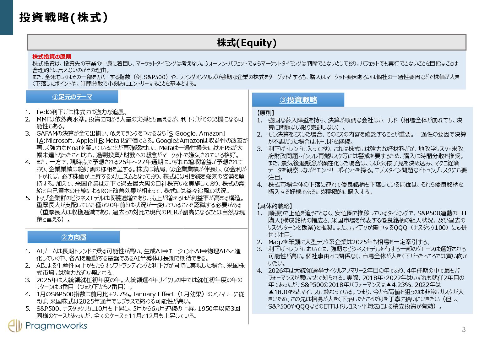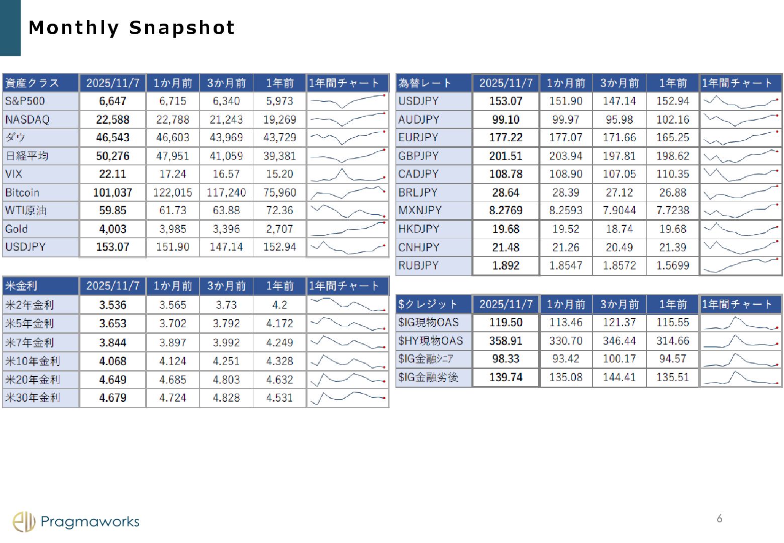 高市トレード(積極財政・金融緩和維持スタンス) 1. 日米金利差が縮小し、本来であれば140円割れ程度まで円高が進行 しても不思議ではない環境は不変。少なからずの違和感を得ながらもド ル高円安状況が続いている。その要因としては『まだ高市トレードの賞味 期限内』『根強い米国のインフレ懸念』『日本の財政懸念』『日本のマイ ナス実質金利』・・・等々色々考え得る。上記のひとつひとつは今のところ 決定打ではないように見えるが、逆にこれら全てが少しずつ影響を与え、 今のドル高円安水準が維持されているものと考える。 2. 日米金利差縮小はペースが緩慢になるとはいえ進む模様。溜まってい た円買いポジションが一掃され落ち着いた後(足元米政府機関の閉鎖 で公表が止まっている)、再びドル売り円買いPlayが再開されると想定。 ただし最大155円程度までの円安があり得る。 外貨投資の原則 外貨投資においては、為替の方向感にベットして為替差益を狙うような投機的な取引はしない。あくまでも、円資産への集中リスクを回避するための⾧ 期的な通貨分散、資産分散を目的とする。 よって、マーケットタイミングを判断するよりも、購入タイミングを分散することでリスクを軽減しながら、上記目的を達成することを推奨する。 1. 原則USDポジションをキープし、USD建運用のメリットを享受。 2. 各々の資産運用プラン(例:ドル建債券の購入)を実行するため に必要なドルの手当てについては積極的に進める。その際、購入する 資産の円高抵抗力の検証をすること、及び購入タイミングを分散する ことが重要。 3. 既にUSD比率が高い方については150円以上のドル高円安水準で はドルを購入する必要はなく150円割れを待ちたい(一方、ドル比 率を高めている途上のケースは、現状水準から慎重に押し目買いを 進めたい)。 【Mr.EのFXコメント】 トランプはドル安を好むためドルインデックスは年初来▲8.4%と弱いが、ドル円は ▲1.6%しか下げていない。実質金利の低い円は選好されず、資金は“円→ド ル以外の通貨”へ向かった結果、クロス円買いがドル円を下支えしたのだろう。10 月の“対中100%関税”発言で一瞬リスクオフも、米政府閉鎖回避や株高でド ル円は再びじり高。12月FOMCの利下げ観測後退で米金利が高止まりする一 方、高市政権で日銀の利上げ期待はさらに後退。今後1カ月も金利差構造は 変わりにくく、基本は押し目買い。最終的なブレイク方向は、米金利・関税・日 銀スタンスのいずれかが明確に動くタイミングになると考える。 5