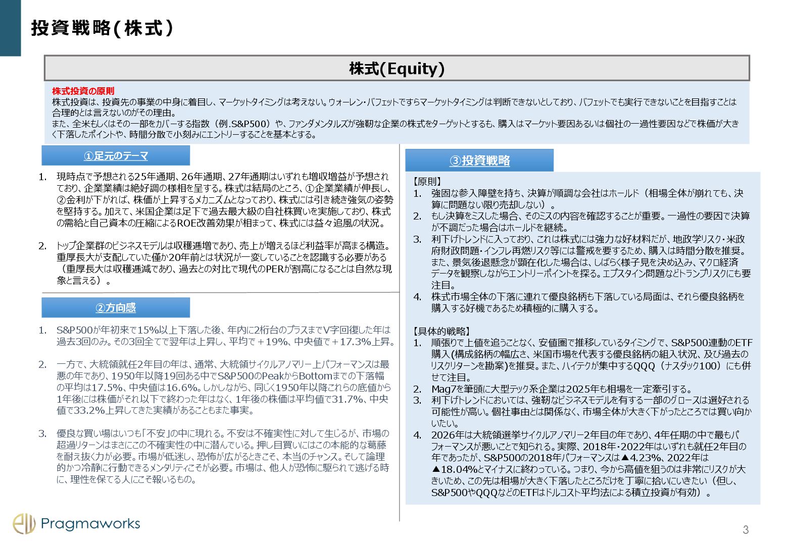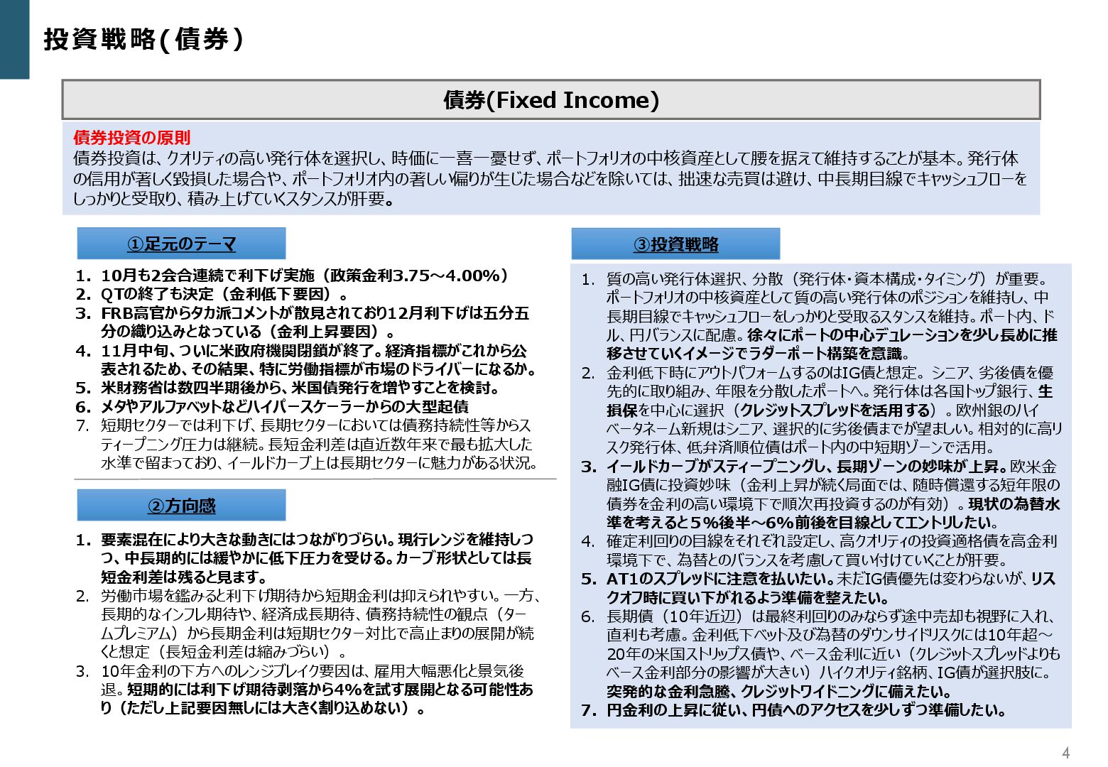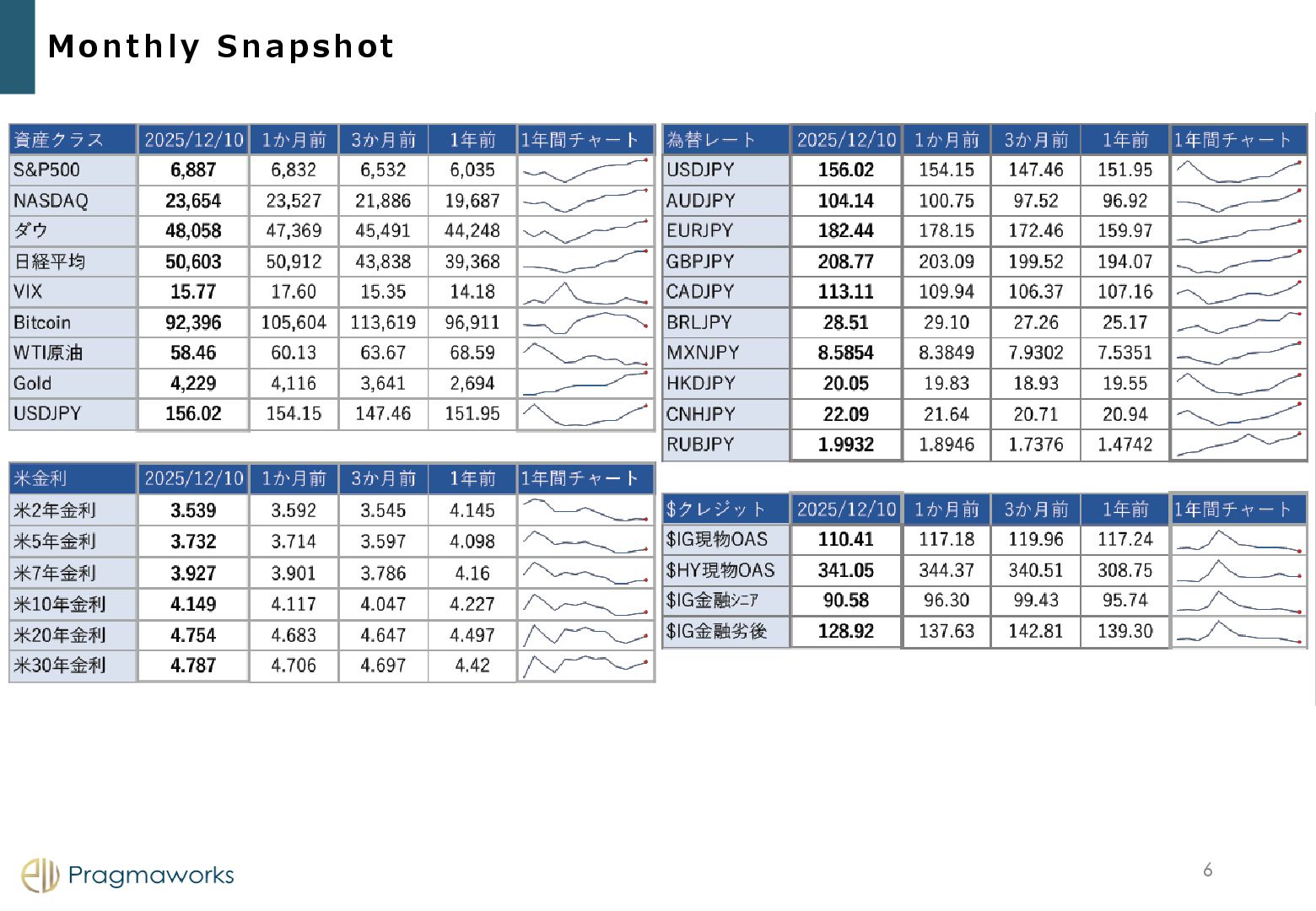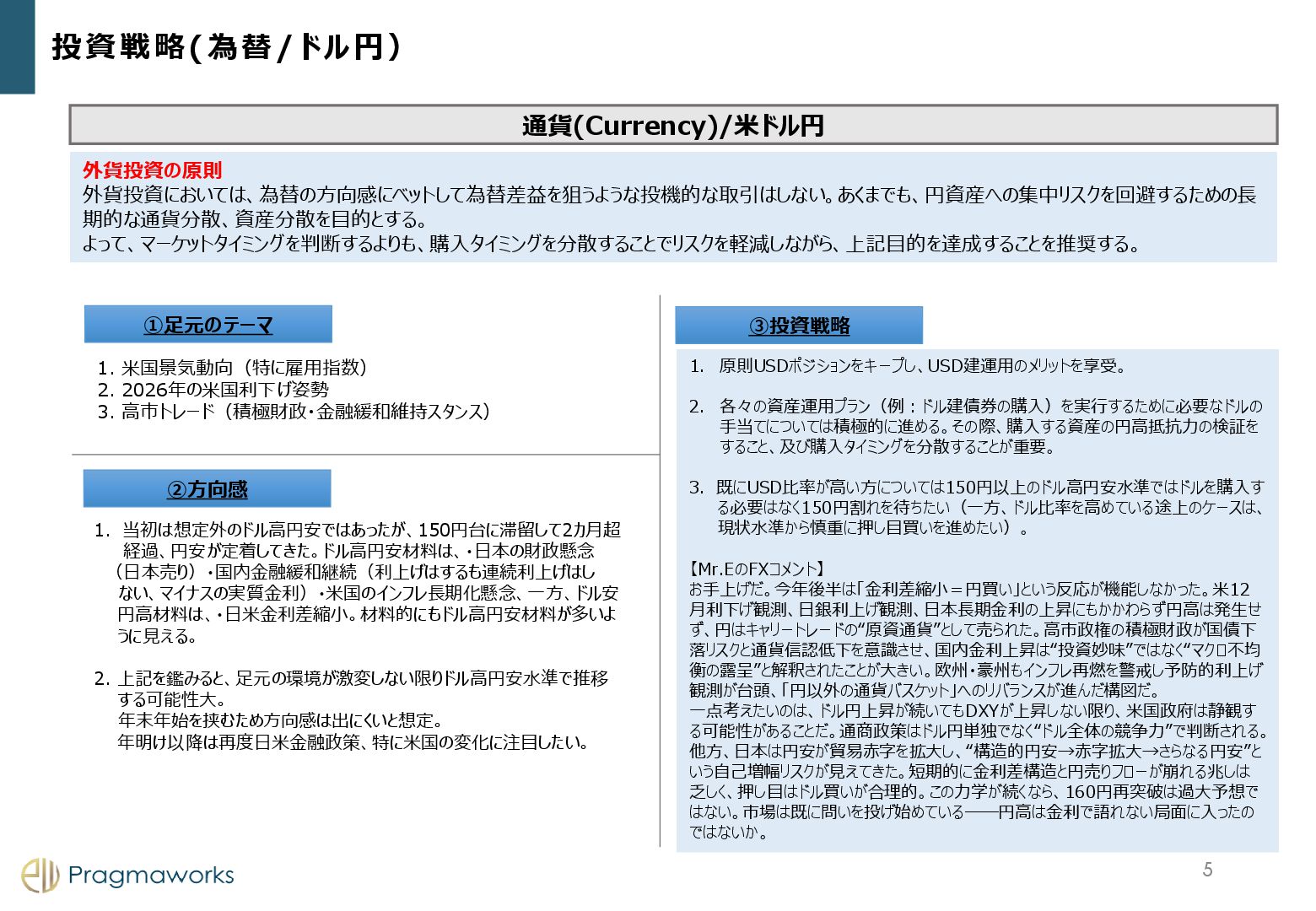 高市トレード(積極財政・金融緩和維持スタンス) 1. 当初は想定外のドル高円安ではあったが、150円台に滞留して2カ月超 経過、円安が定着してきた。ドル高円安材料は、・日本の財政懸念 (日本売り)・国内金融緩和継続(利上げはするも連続利上げはし ない、マイナスの実質金利)・米国のインフレ⾧期化懸念、一方、ドル安 円高材料は、・日米金利差縮小。材料的にもドル高円安材料が多いよ うに見える。 2. 上記を鑑みると、足元の環境が激変しない限りドル高円安水準で推移 する可能性大。 年末年始を挟むため方向感は出にくいと想定。 年明け以降は再度日米金融政策、特に米国の変化に注目したい。 外貨投資の原則 外貨投資においては、為替の方向感にベットして為替差益を狙うような投機的な取引はしない。あくまでも、円資産への集中リスクを回避するための⾧ 期的な通貨分散、資産分散を目的とする。 よって、マーケットタイミングを判断するよりも、購入タイミングを分散することでリスクを軽減しながら、上記目的を達成することを推奨する。 1. 原則USDポジションをキープし、USD建運用のメリットを享受。 2. 各々の資産運用プラン(例:ドル建債券の購入)を実行するために必要なドルの 手当てについては積極的に進める。その際、購入する資産の円高抵抗力の検証を すること、及び購入タイミングを分散することが重要。 3. 既にUSD比率が高い方については150円以上のドル高円安水準ではドルを購入す る必要はなく150円割れを待ちたい(一方、ドル比率を高めている途上のケースは、 現状水準から慎重に押し目買いを進めたい)。 【Mr.EのFXコメント】 お手上げだ。今年後半は「金利差縮小=円買い」という反応が機能しなかった。米12 月利下げ観測、日銀利上げ観測、日本⾧期金利の上昇にもかかわらず円高は発生せ ず、円はキャリートレードの“原資通貨”として売られた。高市政権の積極財政が国債下 落リスクと通貨信認低下を意識させ、国内金利上昇は“投資妙味”ではなく“マクロ不均 衡の露呈”と解釈されたことが大きい。欧州・豪州もインフレ再燃を警戒し予防的利上げ 観測が台頭、「円以外の通貨バスケット」へのリバランスが進んだ構図だ。 一点考えたいのは、ドル円上昇が続いてもDXYが上昇しない限り、米国政府は静観す る可能性があることだ。通商政策はドル円単独でなく“ドル全体の競争力”で判断される。 他方、日本は円安が貿易赤字を拡大し、“構造的円安→赤字拡大→さらなる円安”と いう自己増幅リスクが見えてきた。短期的に金利差構造と円売りフローが崩れる兆しは 乏しく、押し目はドル買いが合理的。この力学が続くなら、160円再突破は過大予想で はない。市場は既に問いを投げ始めている――円高は金利で語れない局面に入ったの ではないか。 5