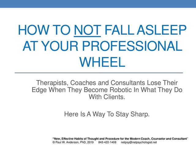 How To Not Fall Asleep At Your Professional Wheel. Therapists, Coaches and Consultants Lose Their Edge When They Become Robotic In What They Do With Clients.