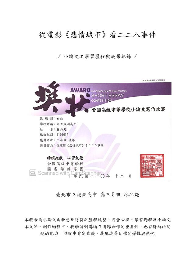 於回應 228 下午成立之「緝煙調查委員會」於 301 上午 10 時開會時提出的五項要求 (1、立即解除戒嚴令;2、被捕之市民應即開釋;3、下令不准軍、憲、警開槍;4、 官民共同組織處理委員會;5、要求陳儀長官對民眾廣播)(財團法人二二八事件紀 念基金會,2006),臺北區也於當日晚上 12 時解除戒嚴(集會遊行仍然禁止)。 (三)「電影中的第三次廣播」310 「臺灣同胞,昨天我宣布臨時戒嚴,我此刻以十二萬分誠意,告訴最大多數的善良 百姓,我的宣布戒嚴,完全是為了保護你們,你們千萬不要聽信奸人的謠言,有點 疑惑,有點恐慌,對於守法的百姓,絕不稍加傷害,你們千萬放心。我之所以宣布 戒嚴,完全是為了對付絕少數的亂黨叛徒,他們一天不消滅,善良的同胞,一天不 得安寧。」(《悲情城市》。01 :30: 58 ) 廣播結束,寬美來到文清家,文清告訴寬美:「寬榮平安,囑我先回,林老師 每日至公會堂開會,臺北死很多人,民心惶惶。」(《悲情城市》。02 :38 : 32 ) 並 回憶,當時與寬榮到臺北時,寬榮先下車觀察,被臺北打打殺殺的景象震懾,而獨 自留在車上的文清被用日文問起:「你是哪裡人?」時,答不出來,差點被打,還 好寬榮及時趕回,解救文清。明顯看出幾天前的臺北街頭已經大亂,非常危險,而 「二二八事件處理委員會」尚盡力解決動亂、爭取臺人權利。 隨後,寬榮負重傷回到文清家,並說:「林先生失蹤了,處理委員會的人都被 抓走,陳儀調兵,一路抓,一路殺。」(《悲情城市》。01 :36 : 52 ) 事實上,約於 304、305 時臺灣動亂除嘉義一帶已大致平息,陳儀卻於 304 打電報向南京請兵來臺, 中央也在隔日允諾派兵,且於 308 傍晚貿然登臺,無預警地武力鎮壓。由寬榮的說 詞可知,「二二八處理委員會」此時已淪陷。廣播中所指之臨時戒嚴,推測應為 309 下午 6 時頒布的臺北基隆戒嚴令,在此推測,本次廣播時間為 310 早上。廣播後,寬 美來訪,下午得知寬榮逃回金瓜石的消息,便再次到文清家,帶受傷的哥哥回家。 電影中,寬榮在臺北的期間,家裡一直有憲兵、警察打擾,寬榮的父親覺得不妥, 便叫寬榮到山上躲起來。可見自從 21 師登陸後,全臺更是愈發緊張。 三次廣播中,可以看出陳儀皆極力安撫人民。而電影中的三次廣播僅占片幅不 到七分鐘,呈現了調兵前的「和平理性」應對。不過在 304 打電報向蔣介石求救調 圖 6、圖 7 文清遭問「你是哪裡人?」被疑為外省人,寬榮被台北打殺景象震懾。