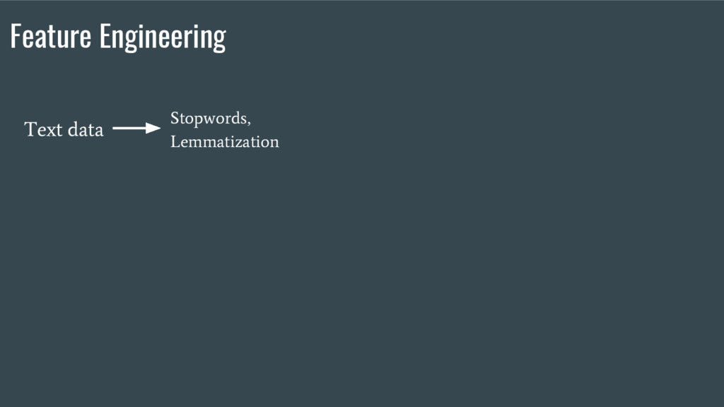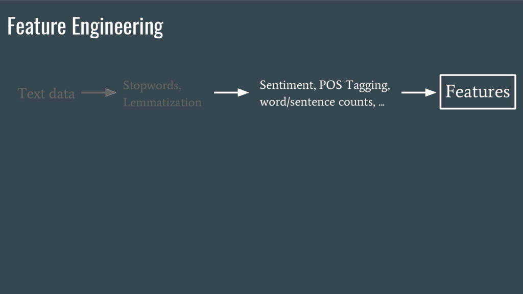 Tagging, word/sentence counts, ... Text data Stopwords, Lemmatization Features Feature Engineering