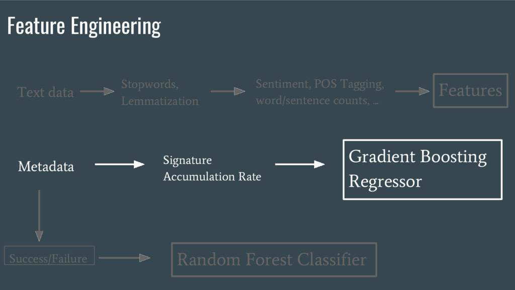 Tagging, word/sentence counts, ... Text data Stopwords, Lemmatization Features Feature Engineering Gradient Boosting Regressor