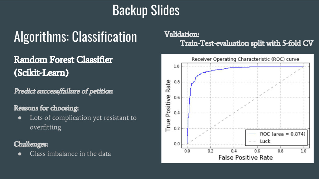 Reasons for choosing: • Lots of complication yet resistant to overfitting Challenges: • Class imbalance in the data Validation: Train-Test-evaluation split with 5-fold CV Backup Slides