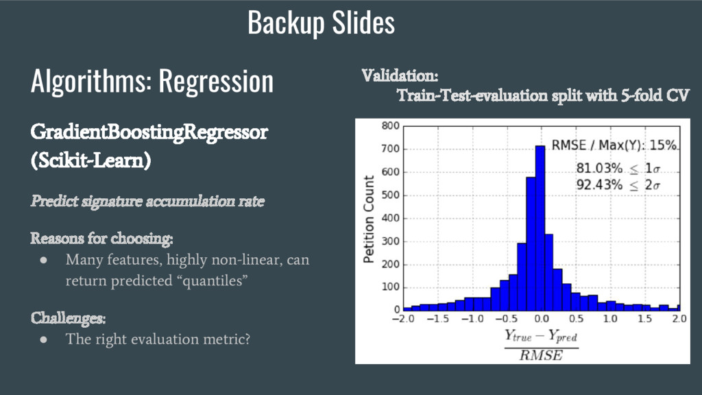 choosing: • Many features, highly non-linear, can return predicted “quantiles” Challenges: • The right evaluation metric? Validation: Train-Test-evaluation split with 5-fold CV Backup Slides