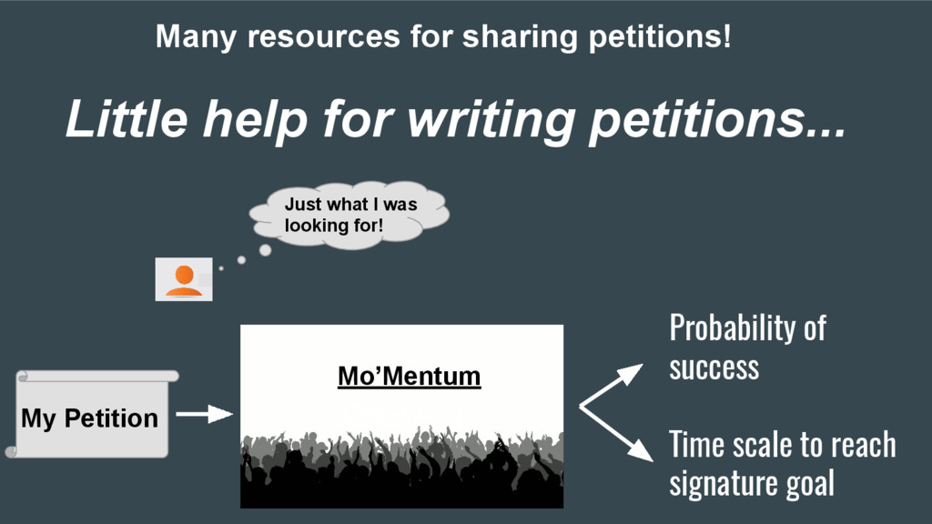 sharing petitions! Little help for writing petitions... My Petition Probability of success Time scale to reach signature goal