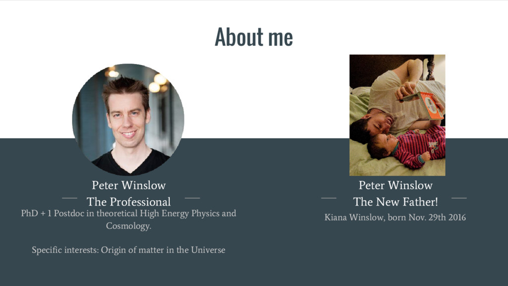 in theoretical High Energy Physics and Cosmology. Specific interests: Origin of matter in the Universe Peter Winslow The New Father! Kiana Winslow, born Nov. 29th 2016