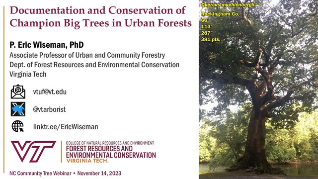 Forestry Dept. of Forest Resources and Environmental Conservation Virginia Tech NC Community Tree Webinar • November 14, 2023 Documentation and Conservation of Champion Big Trees in Urban Forests [email protected] @vtarborist linktr.ee/EricWiseman Quercus muehlenbergii** Rockingham Co. 66’ 113’ 287” 381 pts.