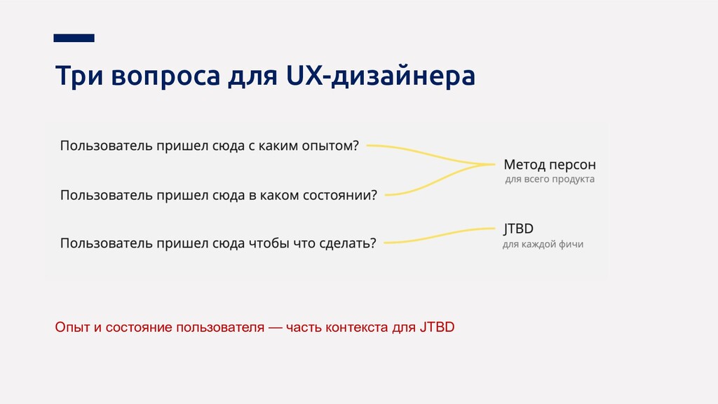 - Информация о пользователях и их опыте является контексом для «задач» в JTBD