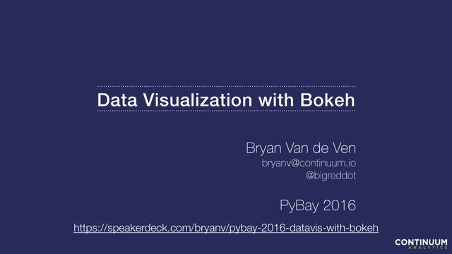 Bryan studied undergraduate CS and Math at UT Austin, and graduate Physics at UCLA. Currently he leads the technical effort for work done on the Bokeh project at Continuum Analytics. Previously, he has worked on feature detection and classification systems for submarine platforms, automated tools for financial risk modeling, and workflow optimization for fluid mixing simulations. He has also taught Basic, Advanced, and Scientific Python courses to more than 1500 students in the last four years.