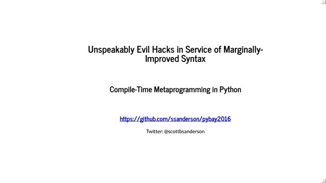 In this talk, we provide an introduction to several lesser-known techniques for hacking extending the functionality of Python. Along the way, we consider the costs (in clarity, portability, or otherwise) of employing nonstandard tools to work around limitations of Python.
