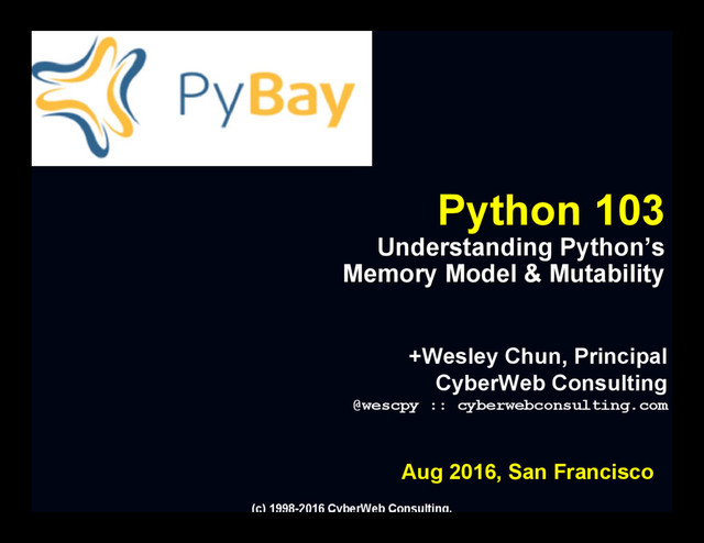 In "Python 101," you learned basic Python syntax. In "Python 102" (or equivalent in experience), you went further, exploring Python more deeply -- creating/using classes, decorators, files, other standard library or 3rd-party modules/packages -- and graduated from being purely a beginner. Because Python has been around the block for quite awhile now, there is a continuously growing number of "Python 103" programmers out there. Many are no longer new to the language, however, they have run into various issues, bugs, or odd behavior in their code that is difficult to explain. It's time to take a closer look. This is an interactive best practices talk, focusing on how Python objects, references, and the memory model work as well as thinking about performance. Knowing more about how the interpreter works under the covers, including the relationship between data objects and memory management, will make you a much more effective Python programmer, and the (main) goal with the knowledge imparted in this talk is to empower developers to not (inadvertently) create certain classes of bugs in their code to begin with! All you need to bring is the desire to learn more about the interpreter to take your Python skills to the next level.