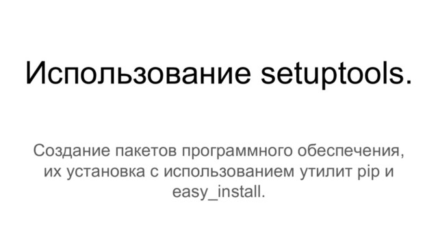 В своём докладе я расскажу как использовать пакет setuptools для подготовки ПО к распространению, использованию утилит easy_install и pip, приведу удачные примеры оформления ПО в виде пакетов.