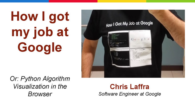I Got My Job At Google Chris Laffra CodeMirror Try it out yourself. See: 1. Study 2. Practice 3. Visualize browser HTML5 Canvas D3.js Edit Replay • Source Line • Animation • Print Output • Edit in the Browser • Use VIM Key Bindings • Experiment/Play • Share/Publish My Approach * Run Record • Python hosted on AppEngine • Scripts versioned in NDB • HTML rendered with Jinja • Scripts executed on server sys.settrace server 1 2 3 4 5 Render $.ajax JSON monkey patch sandbox * = Prior results are no guarantee for future success.