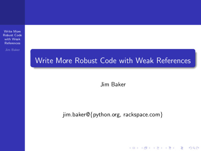 Working with weak references should not just be for Python wizards. Whether you have a cache, memoizing a function, tracking objects, or various other bookkeeping needs, you definitely do not want code leaking memory or resources. In this talk, we will look at illuminating examples drawn from a variety of sources on how to use weak references to prevent such bugs.