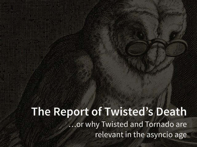 I/O thing. Therefore they are the same kind of thing. I only need one kind of thing in each category of thing. Therefore I only need one of them, and the “standard” one is probably the better one to depend on. So I guess nobody will need Twisted any more!” https://glyph.twistedmatrix.com/2014/05/the-report-of-our-death.html