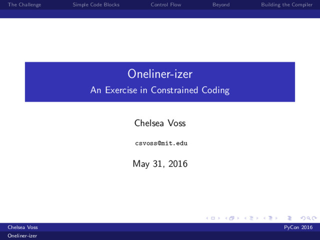 We'll describe the ideas and implementation behind Oneliner-izer, a "compiler" which can convert most Python 2 programs into one line of code. As we discuss how to construct each language feature within this unorthodox constraint, we'll explore the boundaries of what Python permits and encounter some gems of functional programming – lambda calculus, continuations, and the Y combinator.