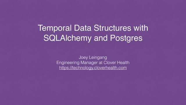 SQLAlchemy ([http://www.sqlalchemy.org](http://www.sqlalchemy.org/)) and Postgres ([https://www.postgresql.org](https://www.postgresql.org/)) provide several useful tools that allow us to build and query records through time: _temporal models_. Combining a need to have robust auditing, as well feature development on per-property history, we can turn “regulatory overhead” into an exciting technical challenge. At Clover Health we have built a small library to automate the task of decorating a model and making it “temporal.” This talk aims to demonstrate the underlying data model and interface for building this system.