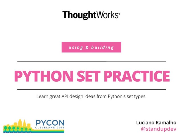 Python's set built-ins and ABCs provide a rich and well designed API. We will consider their interfaces, and how they can inspire the creation of Pythonic APIs for your own classes.